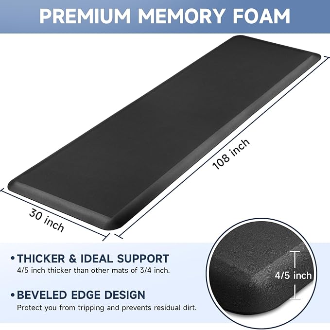 - 【Thicker Mat】The StepRite kitchen mat is made of 4/5 inch thick memory foam for better support and comfort when standing. Measured as 30*108 inches. Suitable for kitchen, office, laundry room or any high-traffic area.