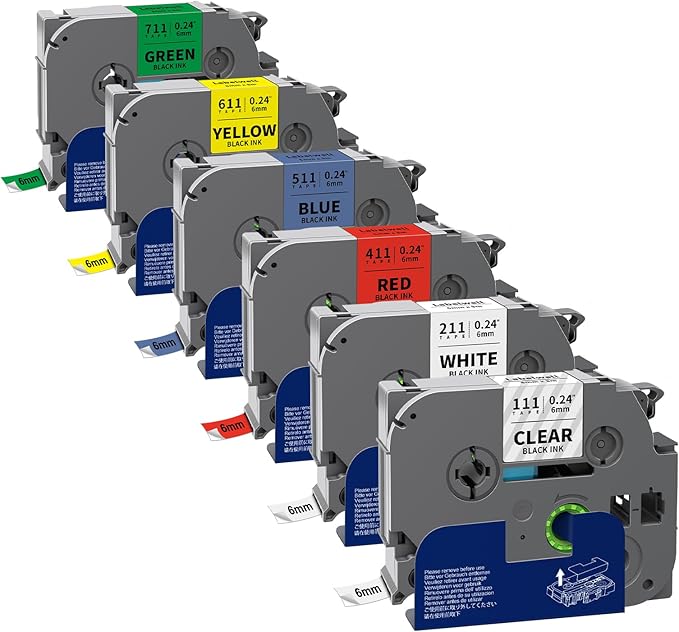 - Package Contents: 6-Pack Compatible for Brother P Touch Label Tape TZe-111 (Black on Clear), TZe-211 (Black on White), TZe-411 (Black on Red), TZe-531 (Black on Blue), TZe-631 (Black on Yellow), TZe-731 (Black on Green)