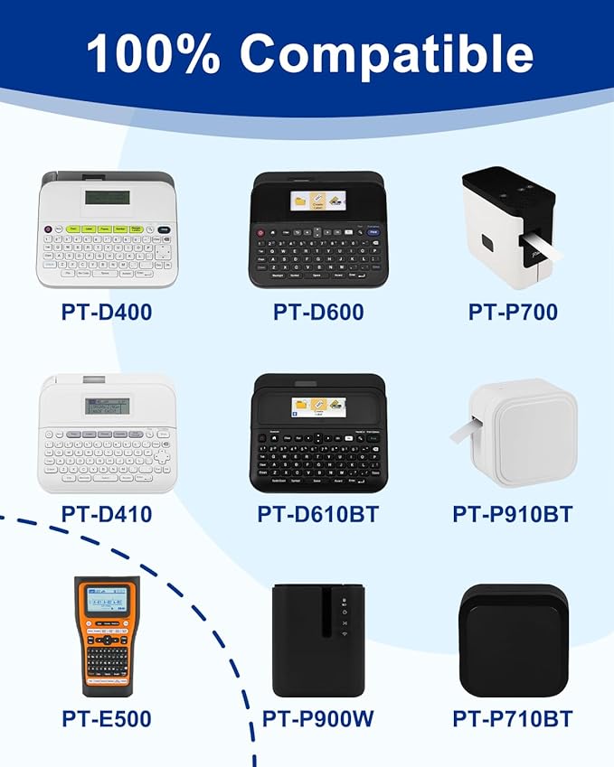 - Compatible with Brother Ptouch Label Maker: PT-D400, PT-D600, PT-D410, PT-D460BT, PT-D610BT, PT-D400AD, PT-D400VP, PT-D600VP, PT-P710BT, PT-P750W, PT-P700, PT-2730VP, PT-H500LI, PT-2730, PT-2430PC, PT-D450, PT-1880, PT-1830, PT-1890SC, PT-2300, PT-300, PT-310, PT-E300, PT-E300VP, PT-E500, PT-E550W, PT-520, PT-530, PT-540, PT-550, PT-1400, PT-1500, PT-1500PC, PT-1600, PT-2110, PT-2200, PT-2210, PT-2300, PT-2310, PT-2400, PT-9700PC ect
