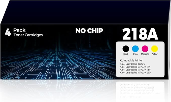 - 218A Toner Cartridges 4 Pack (No Chip) Printer Compatibility: 218A toner ink are compatible with HP Color Laser Jet Pro 3201dw, Color Laser Jet Pro MFP 3301fdw, Color Laser Jet Pro MFP 3301sdw, Color Laser Jet Pro MFP 3301cdw, Color Laser Jet Pro 3201dw toner cartridges, Color Laser Jet Pro MFP 3301fdw toner cartridges, Color Laser Jet Pro MFP 3301sdw toner cartridges, Color Laser Jet Pro MFP 3301cdw toner cartridges, 3301 3302 Series Wireless All-In-One Laser Printer.