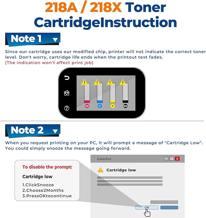 - 218A 218X Toner Cartridges are compatible with Color Laser Jet Pro MFP 3301fdw printer, MFP 3301sdw printer, MFP 3201dw printer, MFP 3301cdw printer.