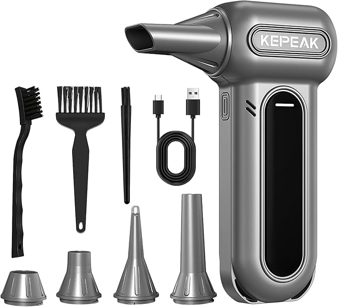 - KEPEAK Compressed Air Duster with Brushless Motor: Experience high-speed cleaning with our electric air duster, featuring a brushless motor that delivers up to 130000 RPM and 200W max power for efficient dust removal on electronics, keyboards, and PC components.