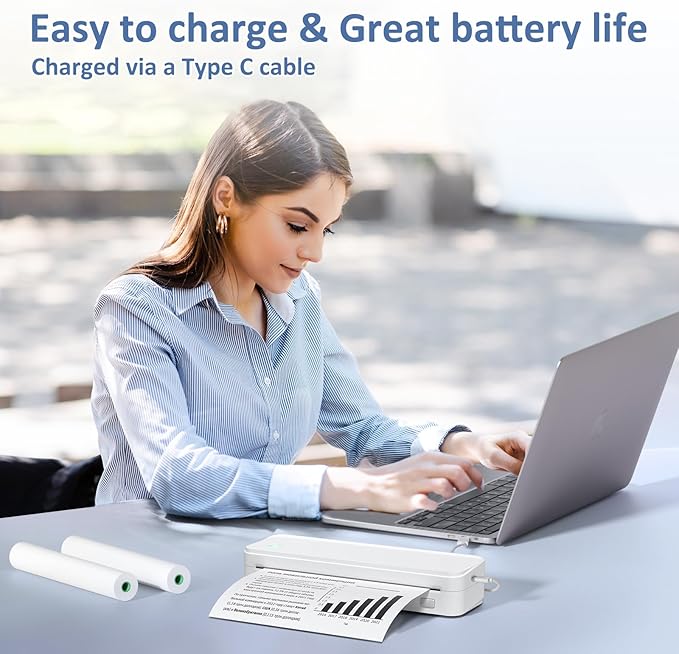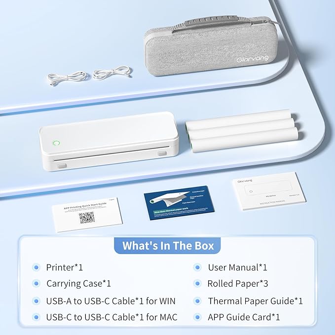 - Inkless Efficiency - Gloryang mobile printer offers cost-effective and inkless printing solutions. Utilizing advanced thermal technology eliminates the need for ink, toner, or ribbons. The package includes a printer, 3 rolls of thermal printing paper(one roll in the printer & extra 2 rolls), a carrying case, a charging cable, instruction manual, and a guide card, etc. Only compatible with Gloryang/Jadens thermal paper, not compatible with Phomemo brand thermal paper or inkjet/laser paper!!