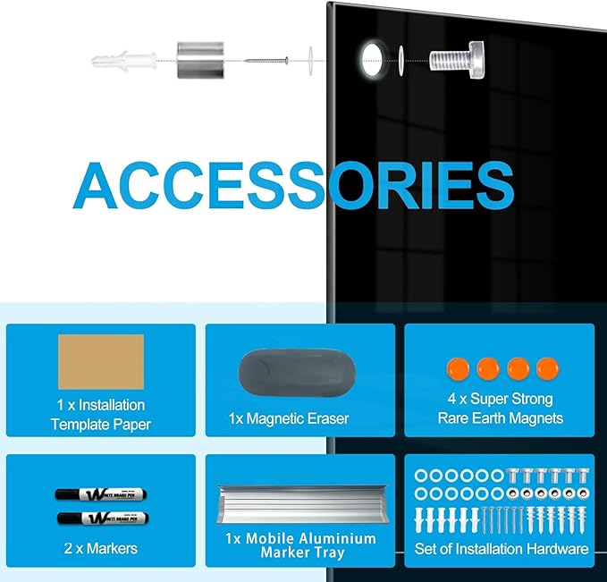 - COMPREHENSIVE ACCESSORIES SET: Comes with one 72" x 36" frameless tempered glass whiteboard, two markers, four magnets, one eraser and one marker tray for mounting. Pay special attention to the magnetism will not be strong due to the thickness of the glass, standard magnets do not work. Please use silvery super strong rare earth magnets. Don't use normal black magnet and fridge magnet.