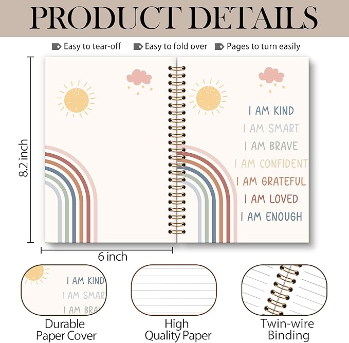 Inspirational Rainbow Notebook Journal - Motivational Nursery Spiral Notebook, I am Kind Inspirational Notebooks Gifts for Kids Girls, Daily Affirmations for Women School Supplies, 6x8.2In