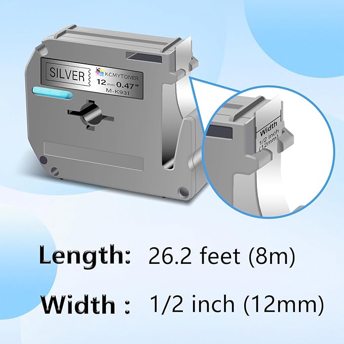 - Package Include: 3 pack KCMYTONER compatible for ptouch M-K931 M931 MK931 M-931 M-K931S non-laminated label maker tape; color: black print on sliver tape; size: 12mm (1/2 inch) x 8m (26.2 feet).
