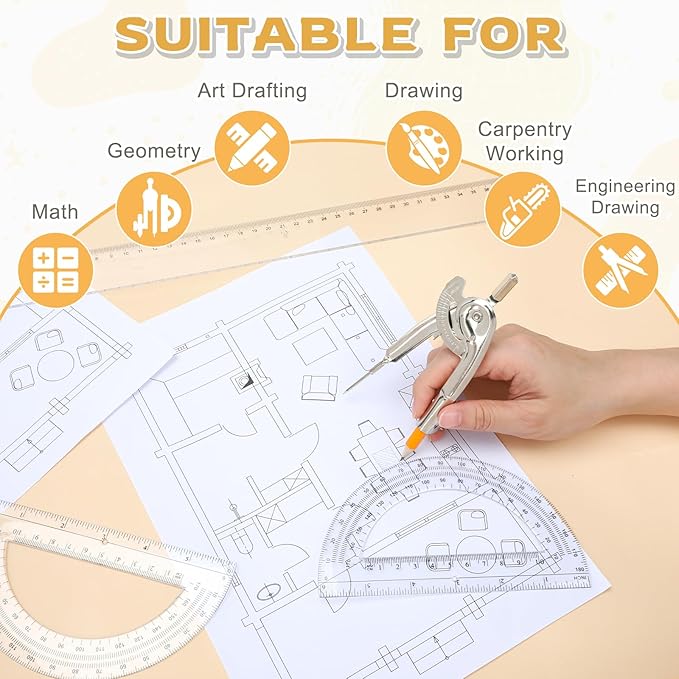 - Widely Used: this exquisite compass drawing tool is widely used in various fields, including mathematics, engineering, carpentry, arts, and drawing. Whether you're a student, teachers, architects, engineers, mathematicians, artists, or a designers, this practical and multifunctional set helps you get the job done quickly and easily