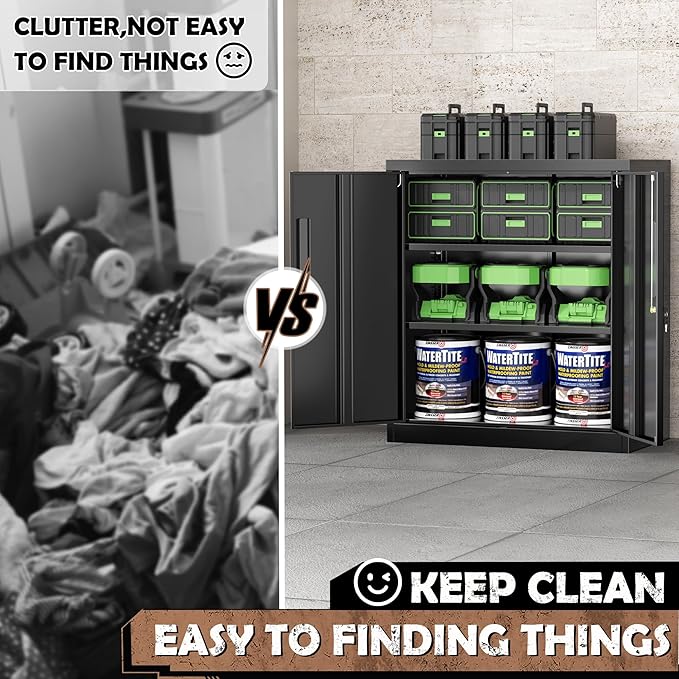- 『HIGH QUALITY MATERIAL』Whole-in-one reinforced heavy duty metal frame, load capacity up to 120lbs per shelf solid and strong. Environmental protection powder, scratch resistance and rust-resistance. Our metal storage cabinets are made of high-strength cold-rolled steel plate, sturdy and durable.