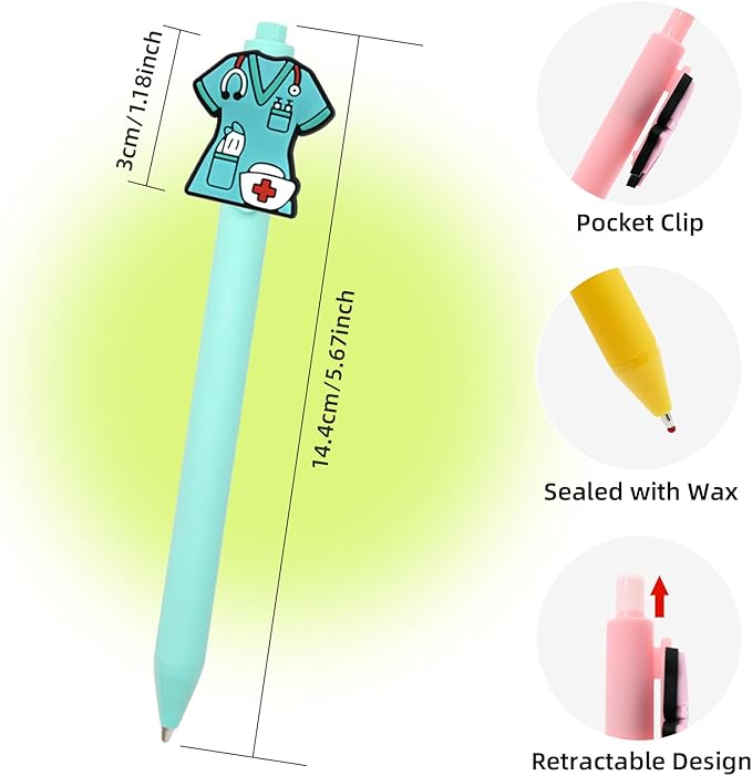 - 10-Pack Nurse-Themed Gel Pens - Brighten Your Shift!10-pack of gel pens. Each pen features charming, professionally-inspired clips showcasing beloved medical icons like stethoscopes, syringes, nurses, pills, ambulances ect