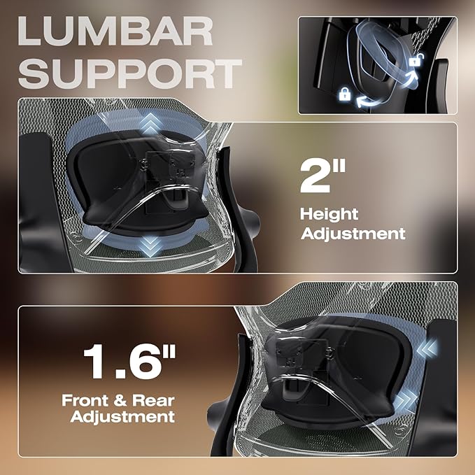 - 【Engineered with Dynamic Spinal Alignment System】3D Synchro-Tilt Lumbar(Lockable ±1.6" depth spring-loaded auto-tracking/±2" height/15° rotation)with force-sensitive springs mimics natural spine curvature, certified by AEP* for 12hrs+ fatigue reduction in ergonomic chairs (*American Ergonomics Partnership)